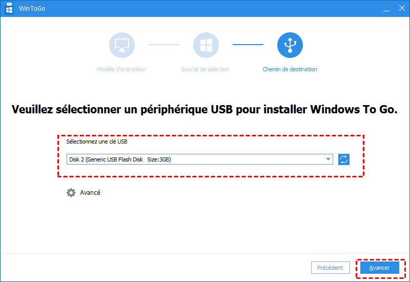 Étape 4. Sélectionnez une clé USB comme cible et cliquez sur Avancer.