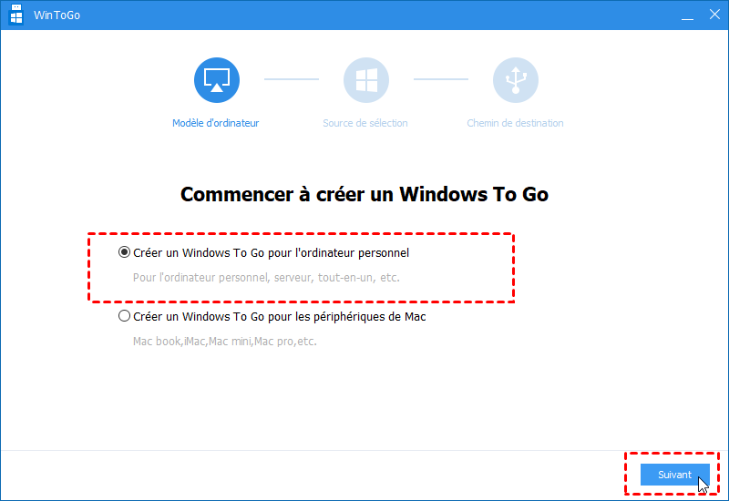 Étape 2. Sélectionnez le modèle d'ordinateur auquel la clé Windows 10 portable sera connectée. Ici, choisissez Créer un Windows To Go pour l'ordinateur personnel.