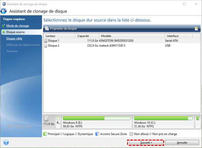Étape 4. Vous verrez alors tous les disques disponibles pour le clonage. Sélectionnez l’ancien disque comme disque source, puis sélectionnez le Crucial MX500 comme disque de destination. Cliquez sur Suivant après avoir sélectionné chaque disque.