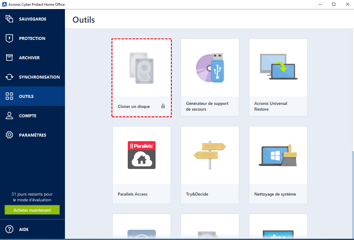Étape 2. Assurez-vous que votre Crucial MX500 est bien connecté. Téléchargez Acronis True Image for Crucial et installez-le. Accédez à l’onglet Outils et cliquez sur Cloner un disque.