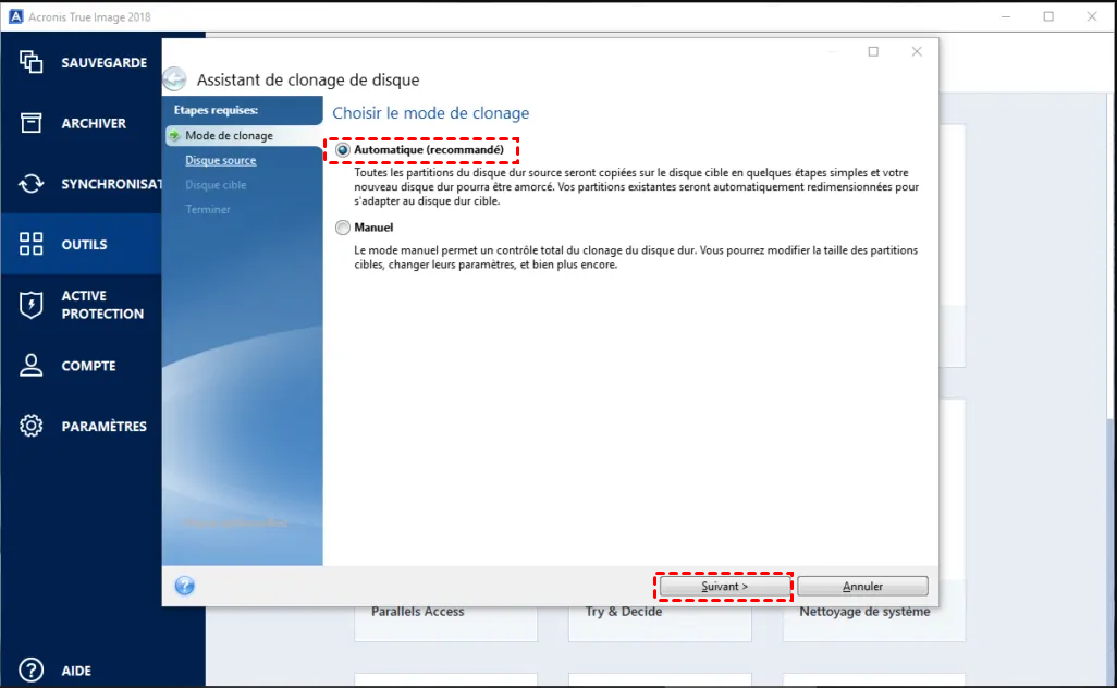 Étape 3. Assurez-vous que Automatique est sélectionné et cliquez sur Suivant. Il clonera le Crucial MX500 et le rendra bootable. La partition sera automatiquement redimensionnée pour s’adapter à l’espace disque cible.