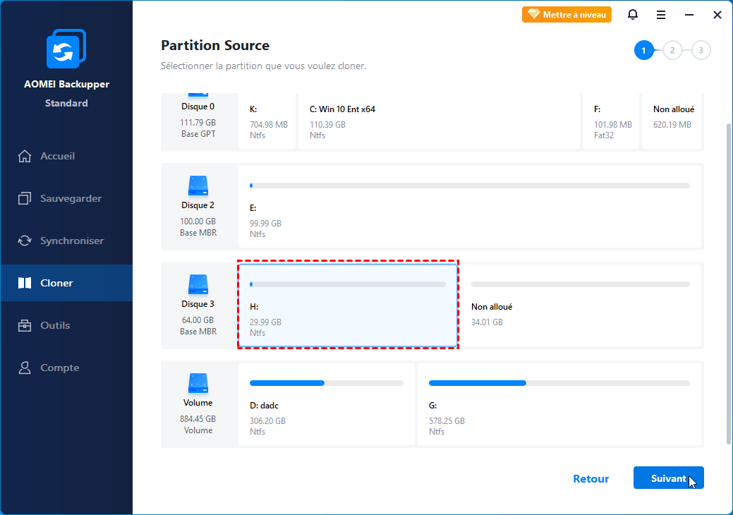 Vous pouvez aussi sauvegarder plusieurs partitions sur un disque dur externe sous Windows 7, puis les restaurer sur Windows 10/11. Ou vous pouvez effectuer un clonage de disque pour cloner toutes les données du disque source, les programmes installés, les paramètres, pilotes et tous vos fichiers critiques (si le disque est un disque système, vous devriez passez à l’édition Professional pour en profiter).