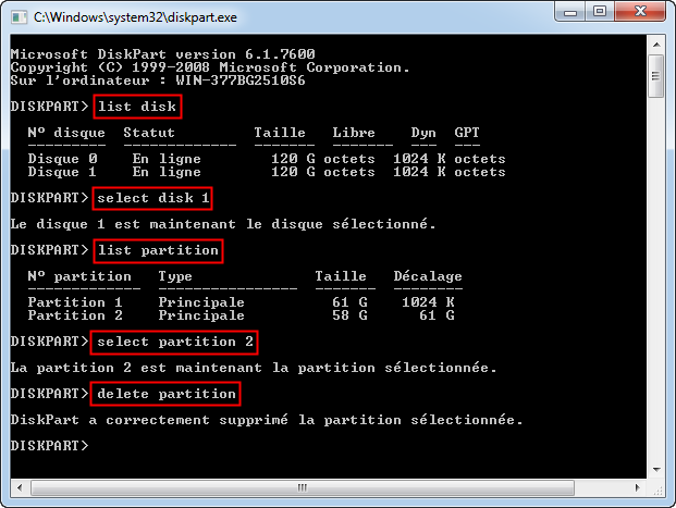 select partition 2, appuyez sur "Entrée", 2 est le numéro de partition à supprimer. - Tapez