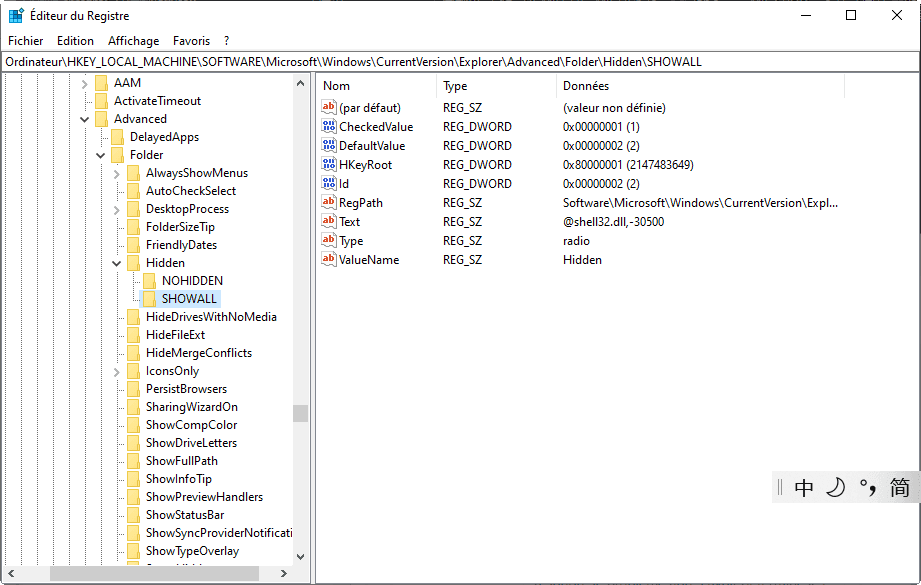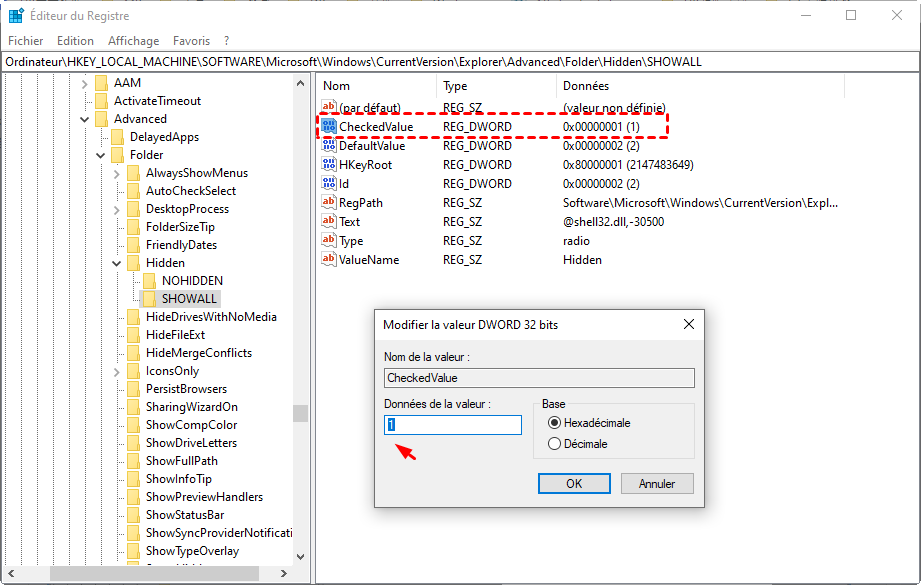 Étape 2. Accédez à : « HKEY_LOCAL_MACHINE\SOFTWARE\Microsoft\Windows\CurrentVersion\Explorer\Advanced\Folder\Hidden\SHOWALL »
