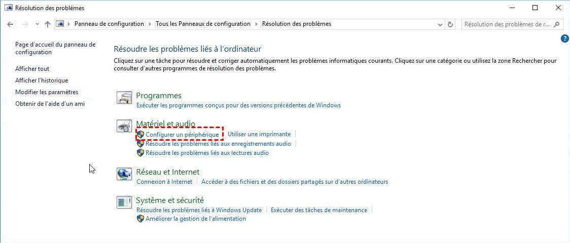 Étape 2. Dans la fenêtre Panneau de configuration, sélectionnez Résolution des problèmes > Matériel et audio > Configurer un périphérique.