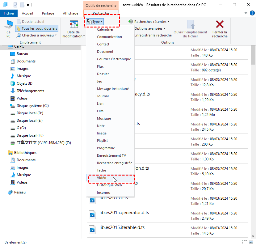 >> Accédez à Ce PC > si vous vous souvenez des noms de fichiers ou des extensions, saisissez-les dans la zone de recherche, par exemple, mp4 > cliquez sur Type > choisissez Vidéos. Sinon, cliquez simplement sur Recherche en haut de la fenêtre, cliquez Type puis sélectionnez Vidéo.