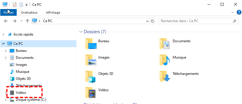 >> Appuyez sur Win + E pour ouvrir Ce PC ou l'Explorateur de fichiers > vérifiez la barre latérale et trouvez le dossier Vidéos sous Ce PC. Toutes les vidéos téléchargées ou transférées avec les paramètres par défaut seront stockées dans ce dossier.