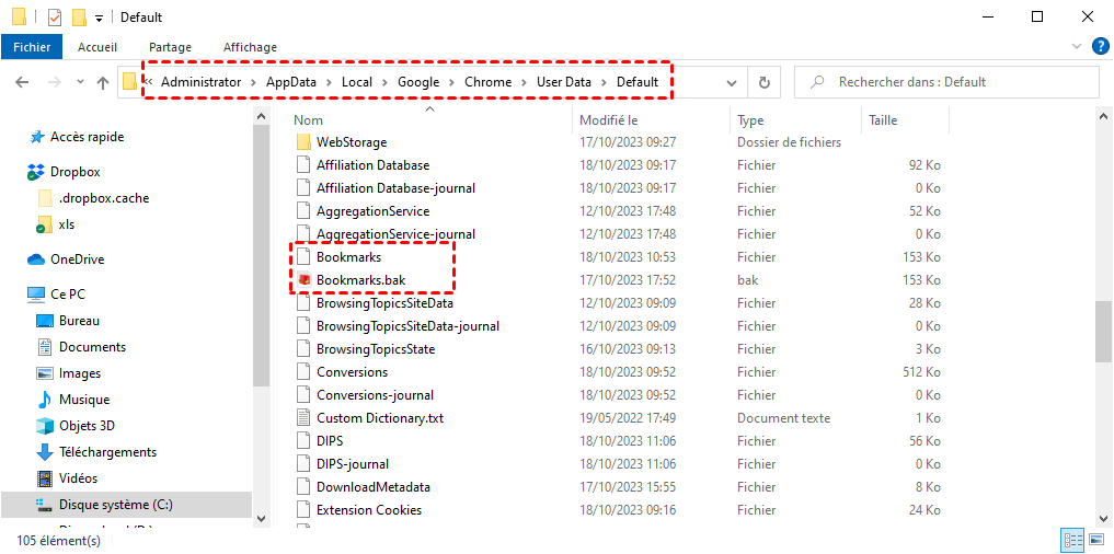 Étape 1 : Veuillez remplacer ici le Nom d'utilisateur par votre nom d'utilisateur (Par exemple : Adminitrator). Accédez directement à ce répertoire, et vous pouvez voir les fichiers Bookmarks/Bookmarks.bak/Boookmarks.msbak ici.