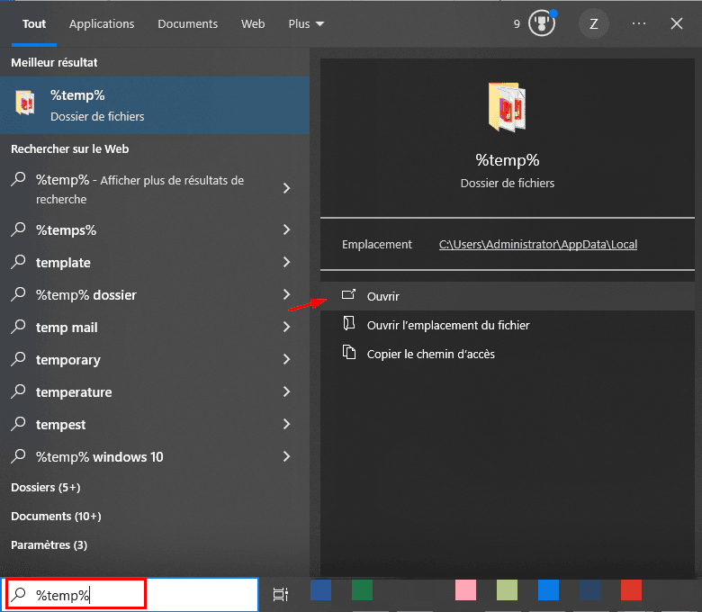 ▶Accéder aux dossiers temporaires du système :