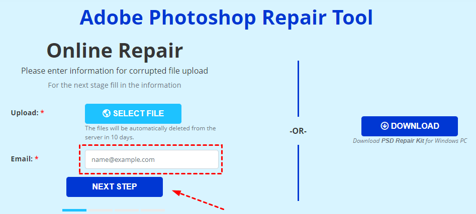 Étape 2. Tapez votre mail et cliquez sur ÉTAPE SUIVANTE. Votre fichier PSD sera envoyé au serveur et commencera à être réparé.