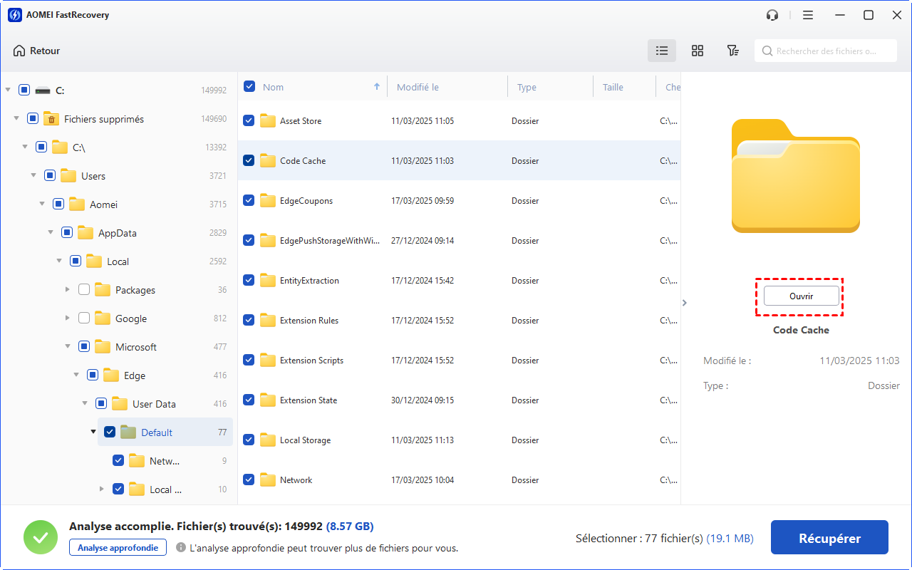 AOMEI FastRecovery analyse votre disque en profondeur pour détecter les fichiers supprimés. Contrairement aux méthodes manuelles qui peuvent être limitées, cet outil permet une récupération avancée, même après un nettoyage automatique du système. Voici quelques de ses avantages :