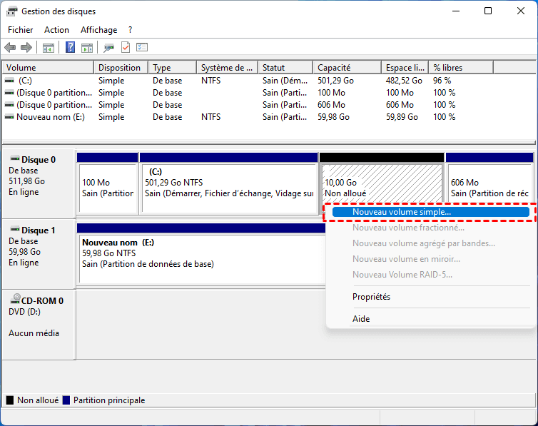 Vous pouvez maintenant créer une nouvelle partition sur le disque dur non alloué pour réparer la table de partition.