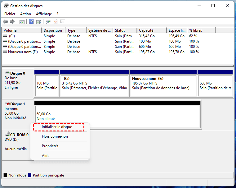 - Lorsque vous initialisez un disque, toutes les tables de partition et systèmes de fichiers existants sont effacés, restaurant ainsi le disque à un nouvel état non alloué. Donc avant de continuer, assurez-vous de sauvegarder toutes les données importantes sur votre disque.