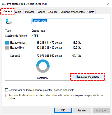 Étape 2. Cliquez avec le bouton droit sur le disque C et sélectionnez l'option Propriétés. Ensuite, sous l'onglet Général, cliquez sur le bouton Nettoyage de disque.