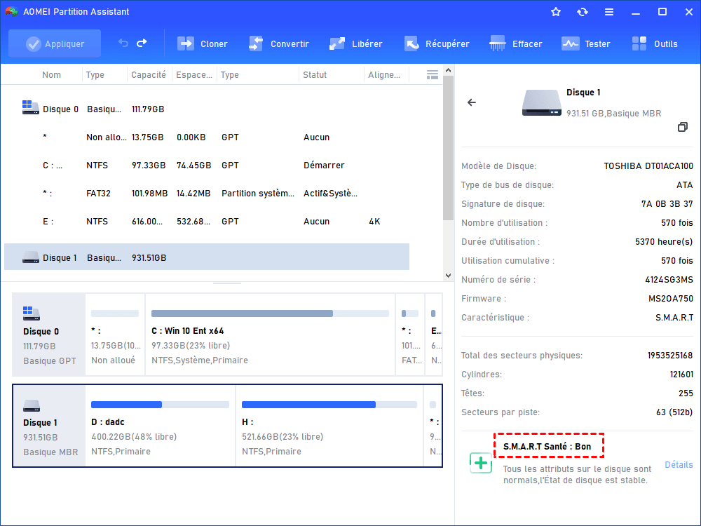 Le logiciel tiers AOMEI Partition Assistant Standard vous permet de connaître facilement l'état de votre disque dur et de corriger les erreurs logiques, et tout cela avec des instructions simples et des rapports clairs. Ce logiciel est gratuit et possède une interface conviviale. Téléchargez-le sur votre ordinateur Windows pour vérifier l’état de votre disque dur.