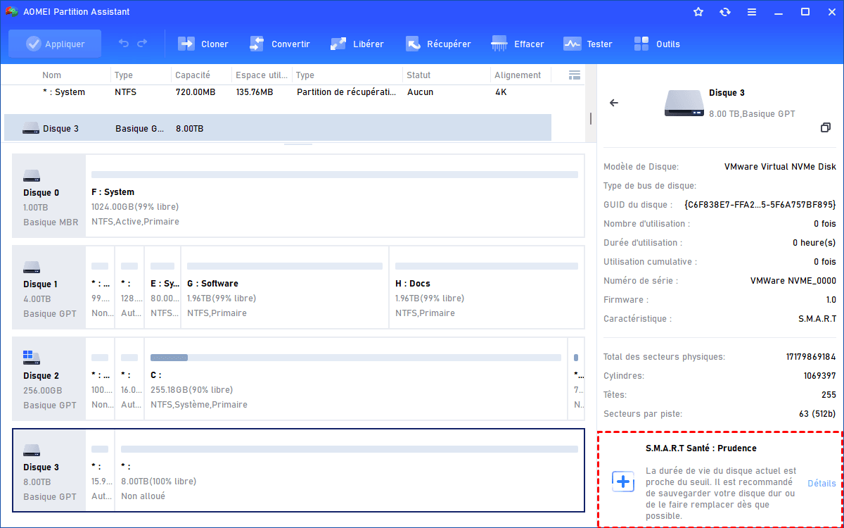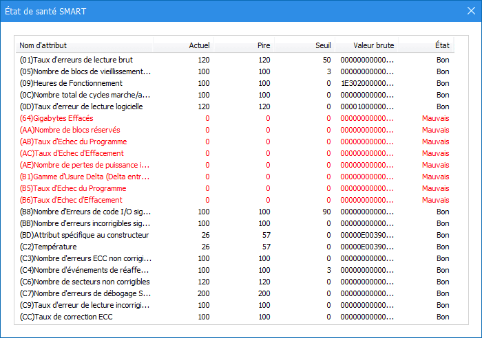 Étape 3. Vous pouvez cliquer sur « Détails » pour voir des valeurs spécifiques de S.M.A.R.T. Le texte rouge indique que la valeur de l'élément est égale ou supérieure au seuil.