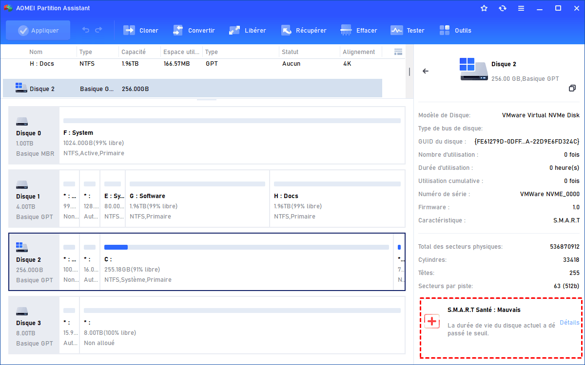 Outils tiers : AOMEI Partition Assistant. Il s'agit d'un outil tiers populaire de vérification de l'état du disque dur qui fournit des informations détaillées sur le disque dur et des rapports sur l'état de santé. Vous pouvez l'exécuter sans problème sur les ordinateurs Windows.
