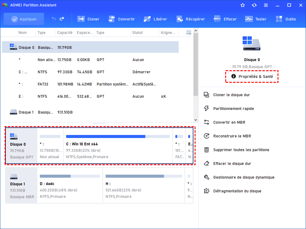 Étape 1. Lancez ce logiciel gratuit sur votre ordinateur Windows 11, 10, 8.1, 8, 7, Vista ou XP. Dans l'interface principale, faites un clic droit sur le disque dur à vérifier. Ensuite, cliquez sur « Propriétés & Santé ».
