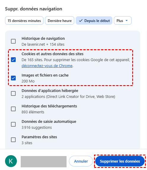 2. Dans la fenêtre qui s’ouvre, choisissez la période Depuis le début, cochez Cookies et autres données de site ainsi que Images et fichiers en cache.