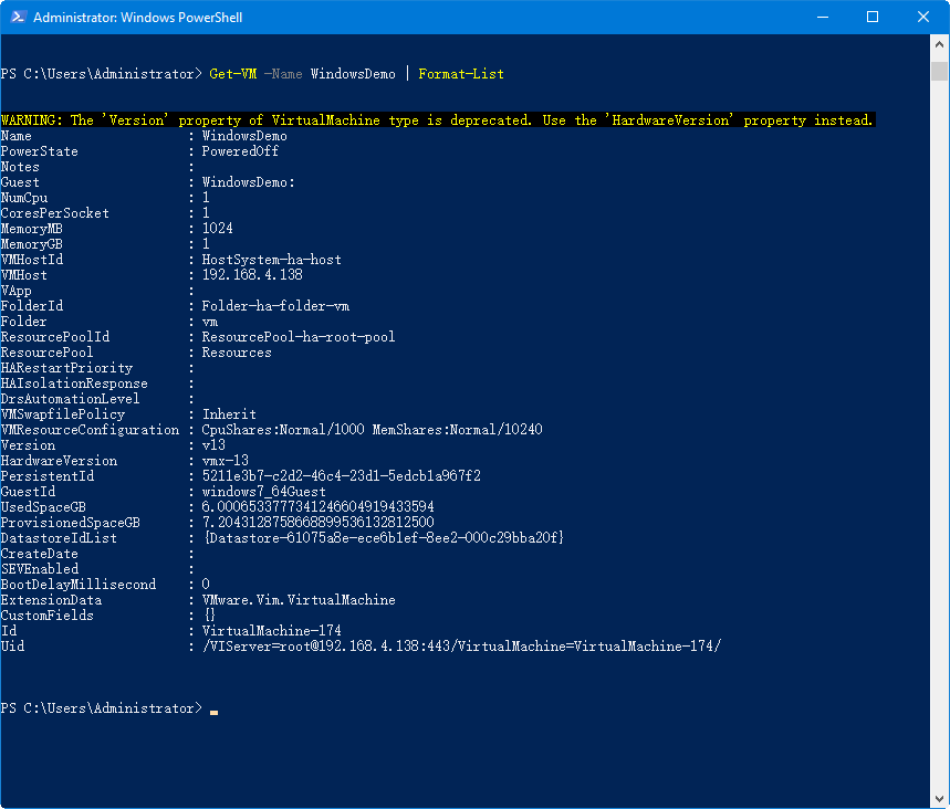 Avec le module VMware PowerShell installé, vous pouvez maintenant utiliser les applets de commande PowerCLI VMware pour gérer vos hôtes et VMs.