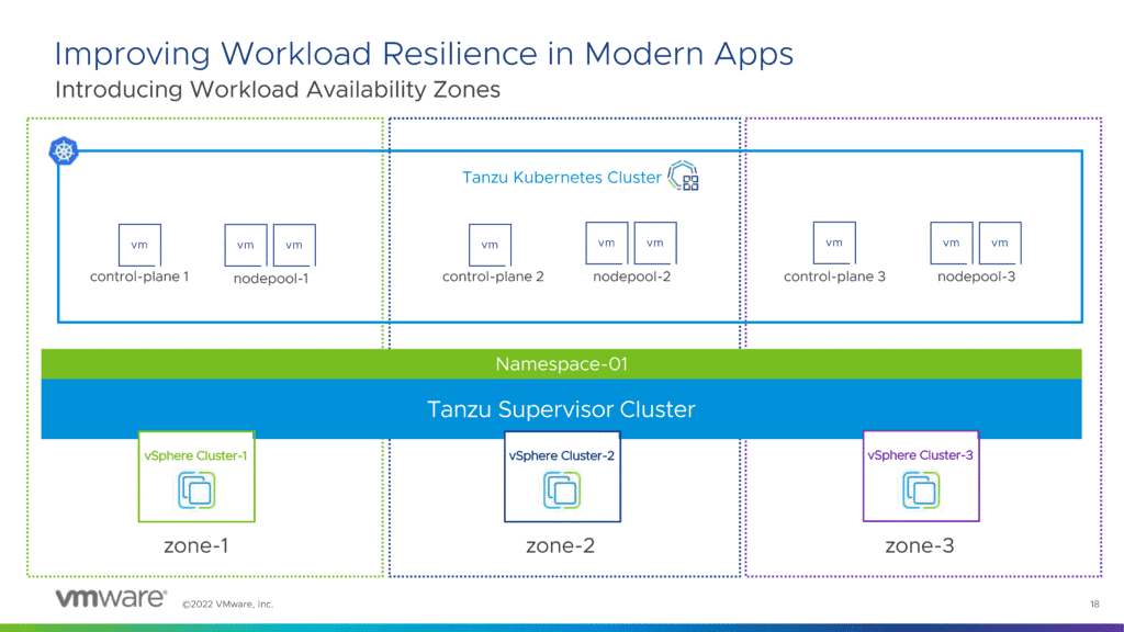 VMware vSphere 8 inclut la dernière version de Tanzu Kubernetes Grid, qui est une excellente mise à jour de vSphere 8 pour les administrateurs et les DevOps travaillant avec des conteneurs. Les zones de disponibilité de charge de travail vous permettent de déployer un cluster Kubernetes sur plusieurs clusters VMware vSphere. Les capacités de Kubernetes sont étendues pour inclure plusieurs zones de disponibilité. Cette fonctionnalité peut améliorer la résilience des applications cloud-native et des charges de travail modernes. La gestion des packages et le cycle de vie des clusters sont simplifiés.