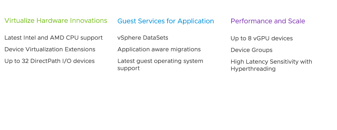 VMware vSphere 8.0 fournit la version 20 du matériel de machine virtuelle. Cette version de matériel virtuel vous permet d'utiliser les dernières fonctionnalités de la nouvelle version de vSphere, notamment :