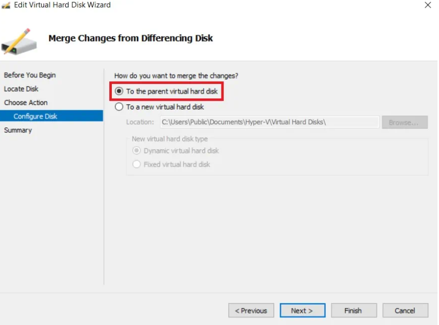 Étape 10 : Répétez les étapes 4 à 9 jusqu’à ce que tous les instantanés soient fusionnés dans le disque parent (.vhdx).