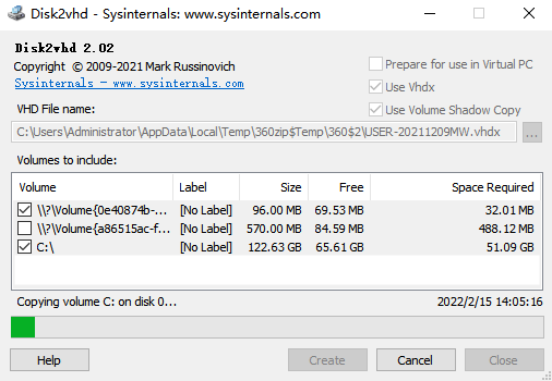 3. Sélectionnez Use Vhdx et Use Volume Shadow Copy. Cliquez ensuite sur “…” pour choisir un emplacement de sauvegarde du fichier .VHDX et sélectionnez les volumes à convertir. Cliquez sur Create.