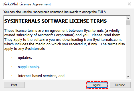 2. Cliquez sur Agree dans la page d’accord de licence de Disk2VHD.