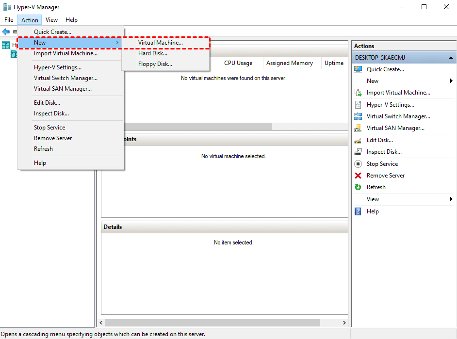 1. Ouvrez le gestionnaire Hyper-V. Cliquez sur Hyper-V host >> New >> Virtual Machine pour créer une nouvelle VM.