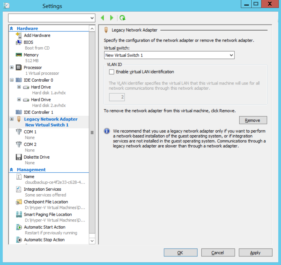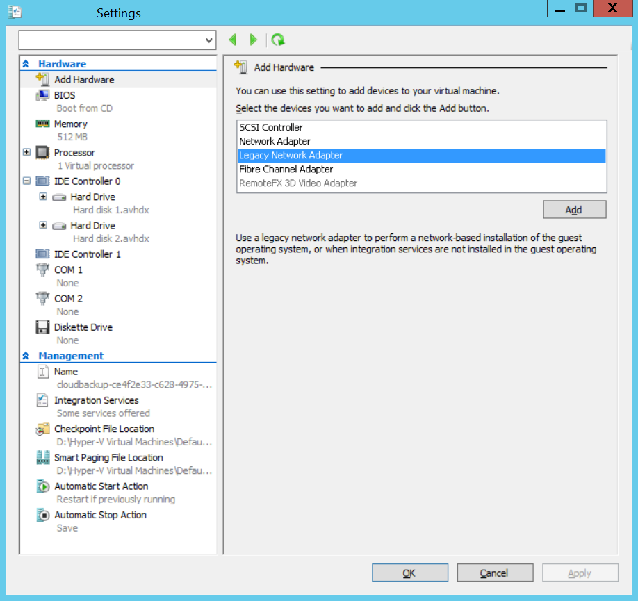 Comme mentionné précédemment, un Hyper-V Internet ne fonctionne pas peut aussi être dû à un adaptateur réseau virtuel incompatible avec le système invité de la machine virtuelle. Dans ce cas, les systèmes d'exploitation invités, par exemple Windows 7 Starter 32 bits, peuvent nécessiter l'installation d'un ancien adaptateur réseau (legacy).