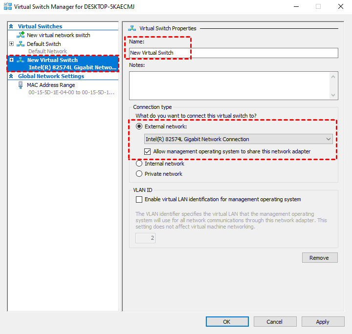 3. Donnez un nom à ce nouveau commutateur réseau virtuel, puis sélectionnez Réseau externe >> Realtek PCIe GBE Family Controller (ou votre adaptateur) >> Cochez Autoriser le système d'exploitation de gestion à partager cet adaptateur réseau.