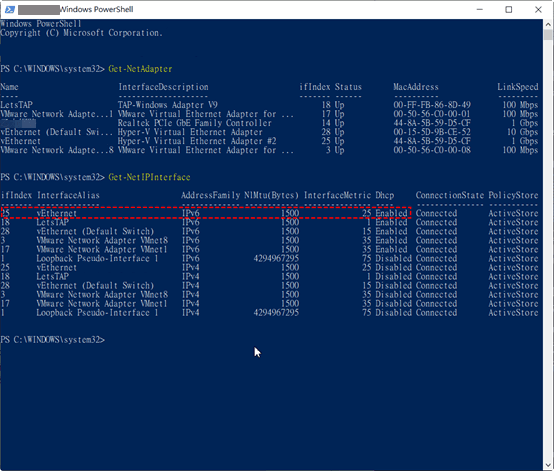 2. Dans la fenêtre, tapez Get-NetAdapter, notez la valeur IfIndex de l'adaptateur réseau virtuel. Appuyez sur Entrée.