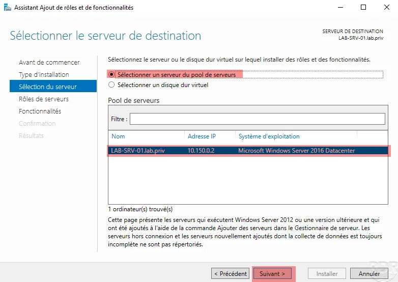 2. Sélectionnez le serveur sur lequel vous souhaitez installer le module PowerShell pour Hyper-V, puis cliquez sur Suivant pour continuer.