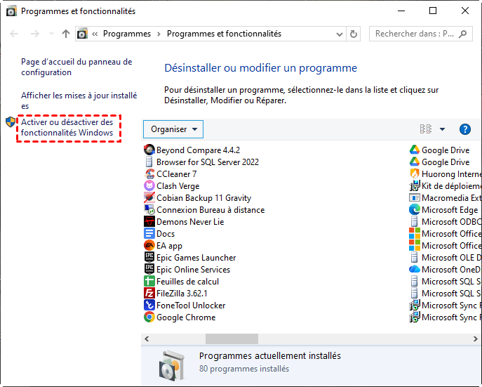 2. Cliquez sur Activer ou désactiver des fonctionnalités Windows dans la fenêtre contextuelle.