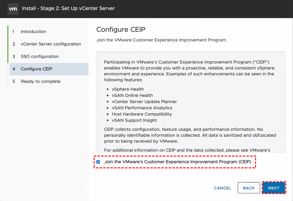 15. Cochez l’option Join the VMware’s Customer Experience Improvement Program (CEIP) et cliquez sur Next pour revoir les paramètres. Ensuite, vous pouvez cliquer sur Finish pour initialiser la mise à jour.