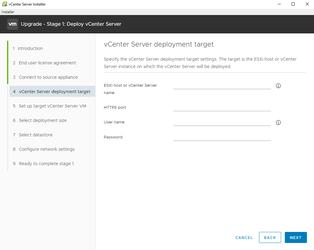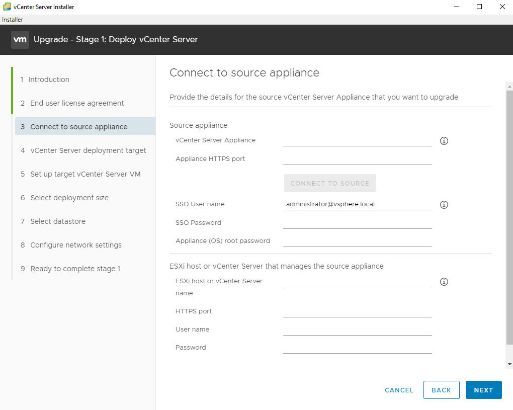 6. Fournissez les détails du vCenter Server Appliance source que vous souhaitez mettre à jour. Entrez le FQDN ou l’adresse IP existante du VCSA et tous les identifiants de connexion pour le VCSA et l’hôte ESXi existants.