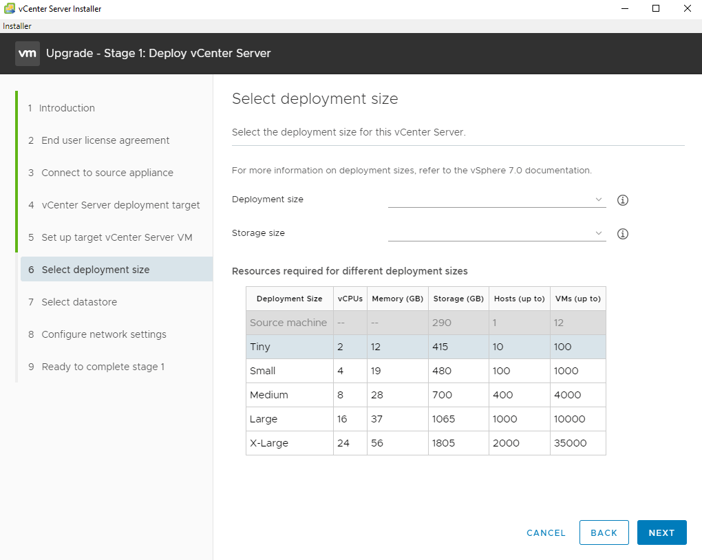 9. Sélectionnez la taille de déploiement pour ce vCenter Server. Vous pouvez vous référer au tableau officiel des ressources requises pour les différentes tailles de déploiement.
