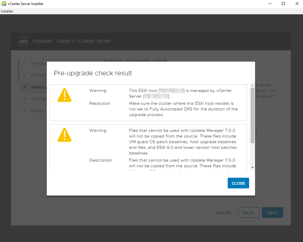 13. L’installeur exécutera automatiquement une Pre-Upgrade check (vérification pré-mise à jour) sur votre VCSA existant. Contrôlez les résultats puis cliquez sur Next pour continuer.