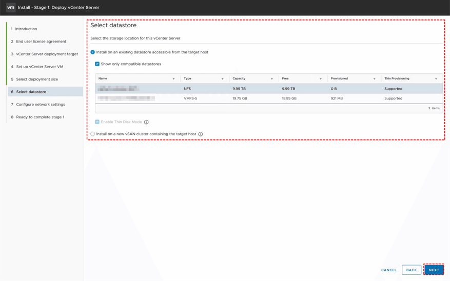 10. Sélectionnez le datastore de stockage pour ce vCenter Server. Vous pouvez choisir d’afficher uniquement les datastores compatibles.