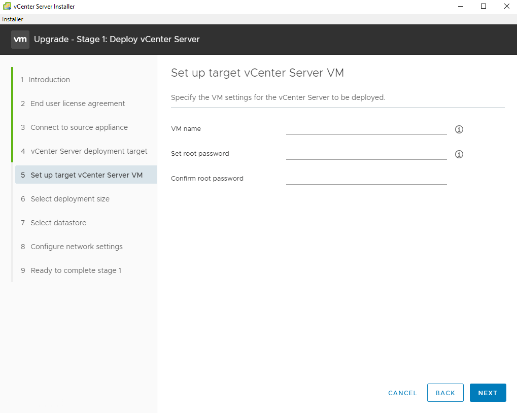 8. Indiquez le nom de la VM et le mot de passe root pour le nouveau vCenter Server 7.0 à déployer.