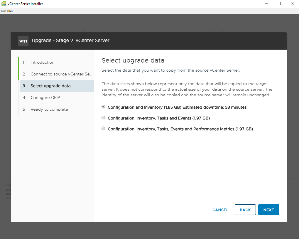 14. Sélectionnez les données que vous souhaitez copier depuis le vCenter Server source.
