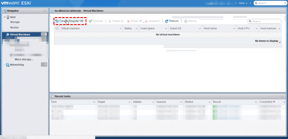 1. Accédez au Client Web ESXi, et allez sur la page Machines virtuelles. Cliquez sur Créer/Enregistrer une VM dans la barre d'outils pour ouvrir l'assistant.
