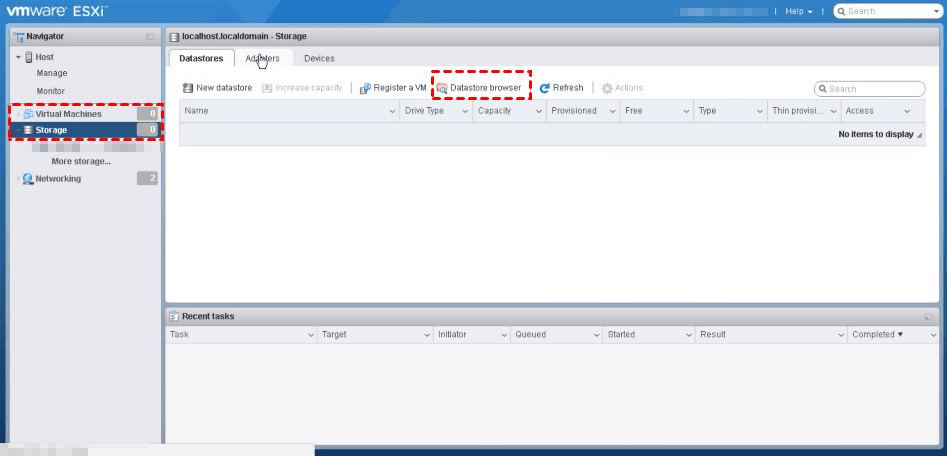 1. Accédez au Client Web ESXi, allez sur la page Stockage, cliquez sur Navigateur de datastore dans la barre d'outils.