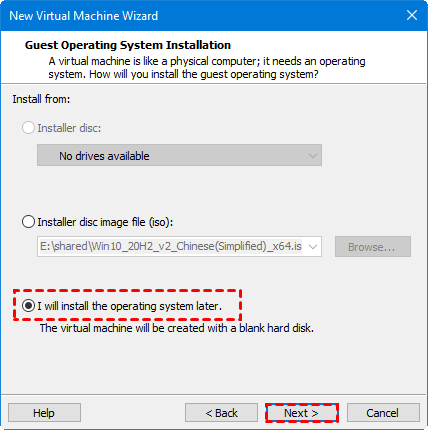 4. Sur la page Installation du système d'exploitation invité, sélectionnez J'installerai le système d'exploitation plus tard, puis cliquez sur Suivant.