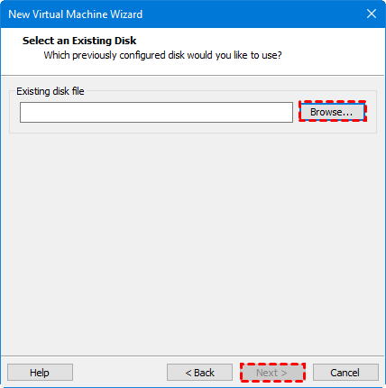 9. Sur la page Sélectionner un disque existant, cliquez sur Parcourir… pour sélectionner le fichier VMDK que vous voulez restaurer.