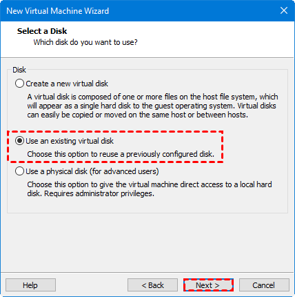 8. Sur la page Sélectionner un disque, choisissez Utiliser un disque virtuel existant, puis cliquez sur Suivant.