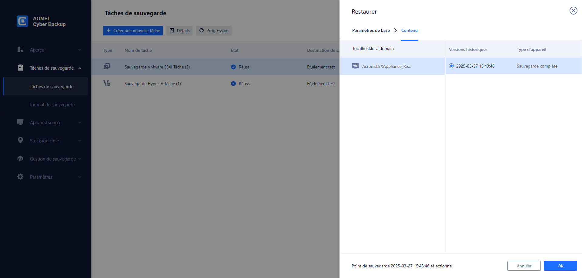 Les tâches de sauvegarde créées seront clairement listées avec leur statut et les détails de la cible, pour une gestion ou une restauration ultérieure.