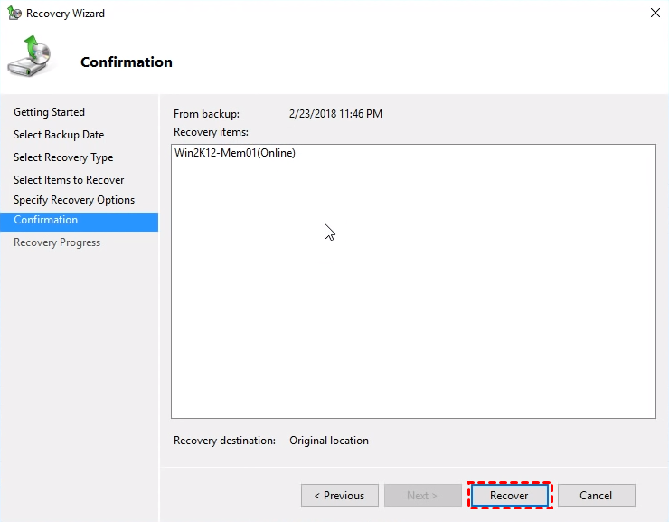 7. Confirmez la sauvegarde et la machine virtuelle Hyper-V que vous allez restaurer, puis cliquez sur Recover pour commencer.