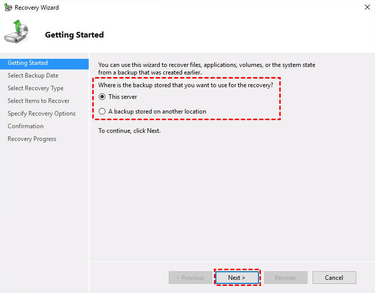 2. Sélectionnez l’emplacement de la sauvegarde que vous souhaitez utiliser pour la restauration, puis cliquez sur Next pour continuer.